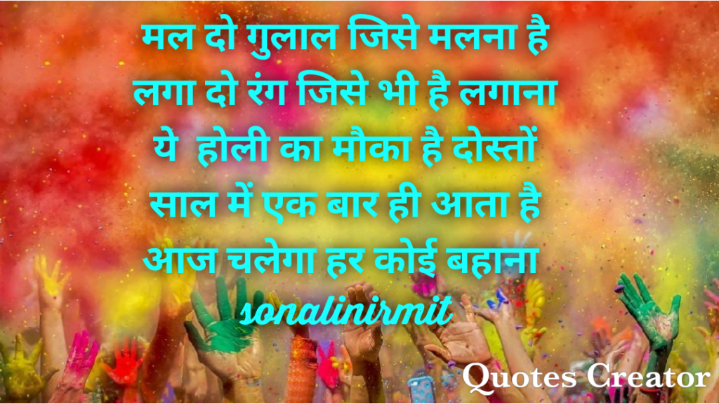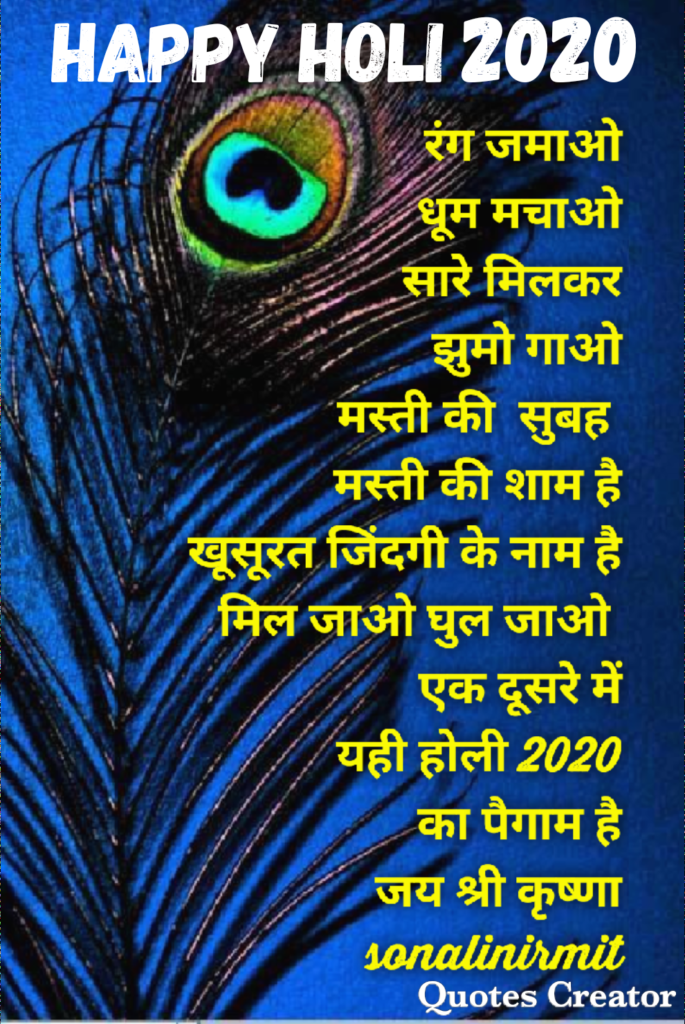 होली का उत्सव होगुंजिया के साथ गपशप होरंगों से घुली ज़िंदगी हो,आप सब को मिली होचेहरे पर मदुहास हो,साथ आपके आपका विश्वास होकार्य कल की बजाए आज हो,समय कोई भी रंग दिखाएआपको जो रंग पसंद हो उस ही का एहसास होहोली मुबारक
